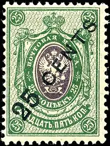 Initially, the offices used the regular stamps of Russia, but in 1899, they received stamps overprinted with "KITAI" (Russian for China) in Cyrillic script. This overprint was applied to all types of stamps up to 1916, including the varieties on horizontally laid, vertically laid, and wove paper. The overprint was also applied to postal stationery envelopes, postcards, letter cards and newspaper wrappers. The overprint itself was in black, blue, or red, generally being chosen to contrast with the stamp colors. Most of these types are commonly available today (less than one US$); the most problematic is the blue overprint on the 14-kopeck wove paper variety, whose existence has been questioned.