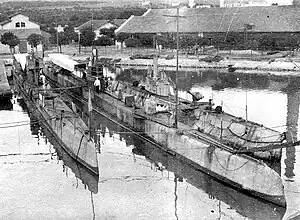 Steel for the first three submarines (AG-21, AG-22, and AG-23) of the second batch ordered by the Russians was assembled in Saint John, New Brunswick by May 1916. Five months later, they were sent to Vancouver by rail in sections where they were loaded into ships and shipped to Vladivostok. There they were loaded onto the Trans-Siberian Railroad and transported to Nikolaev where they were assembled by the Russud Shipyard. Assembly was delayed by the unrest caused by the Russian Revolution and the subsequent Russian Civil War and was not completed until 1919. By this time, Nikolaev was controlled by the Whites and they took AG-22 with them when they evacuated the Crimea in late 1920 as part of what came to be called Wrangel's Fleet.[4] They ultimately were granted asylum in Bizerte in February 1921. AG-22 was abandoned there in November 1923 and subsequently scrapped.[5]