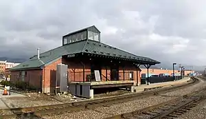 Rutland's first railway station was built near Merchants' Row in 1853-54 by the Rutland Railroad. In 1905-06 wings were added to the north and south of the depot. Passenger service west of Whitehall and Eagle Bridge ended on June 24, 1934.[2][3] The building served the city of Rutland until New York City to Montreal passenger service ended in 1953 (the Rutland RR's Green Mountain Flyer and Mount Royal), and two years later it was demolished.[4][5][6]
