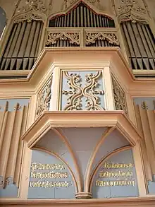 The flat facade has the proportions of the golden section, and is decorated with gothic carvings. The richly-profiled lower casework is divided into three fields, the outer two each containing three stop-knobs. The stylised hour-glasses on the lower casework behind the stop-knobs are symbolic of man's fleeting existence, while the stars on the winged doors represent heaven.[1]: p.97 The lead pipes of the facade are silvered with highly polished tin. The outer two pipe-flats, each of seven pipes, are shaped in late-gothic ogees. The right-hand side contains a dummy pipe to preserve visual symmetry. The two inner pipe-flats, each of fourteen pipes, are rectangular, and are surmounted by a decorative panel of dummy pipes above, in an ogee arch. It is possible that fifteen pipes from the two octave registers, which are constructed differently to the main Prästant, might once have filled this space, as sounding pipes.[4]: 17