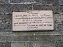 The royal memorial tower, Kongemindet, is located on Rytterknægten. Designed by Gottlieb Bindesbøll, it commemorates the 1851 visit of Frederick VII of Denmark and Countess Danner. The 12.6 metres (41 ft) structure was built by appreciative Bornholmers in 1856, financed entirely with Bornholmer resident donations as reverence to the King and the Danish royal house.[8][9][10] It bears an inscription expressing the Bornholmers' thanks for the visit, stating that it would be called Kongemindet ("royal memorial"). Translated into English, the memorial text on the plaque reads: