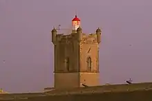 The fort of São Julião da Barra was constructed primarily for defence and follows an irregular pentagonal design. Today it is the national headquarters of the Ministry of National Defence and official residence of the Minister.[3] In 1758 orders were given to build a lighthouse in the fort. However, it is possible that an earlier lighthouse had existed from 1553 but that it was destroyed by the 1755 Lisbon earthquake.[4] The work initially involved building a stone lantern in 1761 but in 1775 an Argand lamp with a parabolic reflector was installed. Between 1848 and 1865 modernization work was carried out and a 4th Order Fresnel lens was installed, producing a fixed white light, fuelled with gas distilled from wood. From 1880 the lighting was obtained from petroleum gas. The lighthouse underwent further repairs in 1893 and 1913. A foghorn was installed in 1916 but almost immediately thereafter operations ceased until 1918 because of the First World War.[5][6]