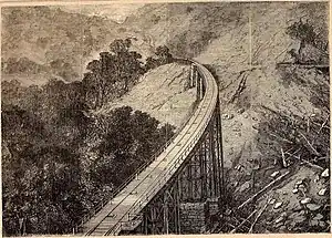 The road was constructed without explosives since it was felt that the slopes were very unstable. The rock was excavated only with plug and feathers. Embankments of 3 to 20 m (9.8 to 65.6 ft) in height were constructed to protect the tracks from the frequent torrential rains in the area, which used about 230,000 cubic metres (300,000 cu yd) rocks. The line did not have any tunnels.[5]