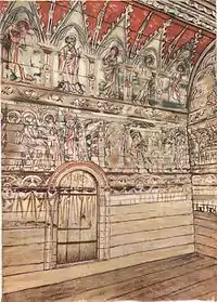 The paintings covering the walls and the trefoil-shaped wooden ceiling of the church were considered one of the best and best-preserved examples of Scandinavian wall-painting from the Middle Ages. The oldest, anonymous, paintings in the chancel dated to 1323. Later paintings in the nave dated from 1493 and were signed by a painter named Amund.