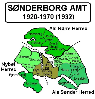 Sønderborg County (Danish: Sønderborg Amt) is a former province in Denmark, located on the island of Als and the easternmost part of Southern Jutland. Sønderborg County was established in 1920 following the reunification of Denmark and South Jutland following the Schleswig Plebiscites. It was dissolved in 1970 when it merged with three other counties to form South Jutland County. Sønderborg County corresponded geographically to the former Prussian Kreis Sonderburg.