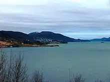 View of the fjord, looking east towards Bruvik. Brøknipa/Bruviknipa on the left and Trengereid on the right