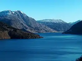 Sørfjorden is a 30-kilometre (19 mi) long fjord in Vestland county, Norway. The fjord flows around the west and south sides of the island of Osterøy, going through the municipalities of Osterøy, Bergen, and Vaksdal. The fjord begins at the village of Vaksdal where the Veafjorden flows into the Sørfjorden, it then heads west and then north before emptying into the Osterfjorden. The fjord flows past the following villages: Bruvik, Vaksdal, Hausvik, Garnes, Ytre Arna, Hylkje, Breistein, Valestrandfossen, Steinstø and Hamre.[1]