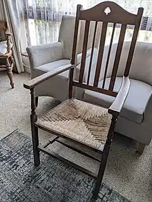 Súgán as a rope could have many uses, being used as a weaving material to make household items such as cradles and baskets.[3] The most recognisable use of it is that of a woven chair seat, commonly known as a súgán chair.[4][5] These chairs tended to have a wooden frame, and the seat being made by weaving súgán through the frame.[6] Some of these chairs looked more like an armchair, with the entire body being wrapped in the rope.[3]