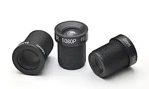 The S-mount is a standard lens mount used in various surveillance CCTV cameras and webcams. It uses a male metric M12 thread with 0.5 mm pitch on the lens and a corresponding female thread on the lens mount. S-mount lenses are often called "M12 lenses". Because the lens mounts are usually attached directly to the PCB of the sensor, they are often called "board lenses".[1] The supported sensor formats range from smaller than 1/6-inch type up to 1-inch having an 16mm diagonal sensor. The lenses lack an iris control. S-mount lenses do not have a flange and therefore there is no fixed lens to sensor distance and they must be adjusted to focus.[2] Due to the small size of the lens barrel, performance is somewhat limited compared to larger lenses[3] and most S-mount lenses are relatively slow (f/1.6 and slower). High-end CCTV cameras generally use C/CS-mount lenses, where much faster apertures like f/1.0 are common.