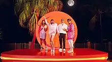 From left to right, Megan Thee Stallion, Lisa, DJ Snake, and Ozuna dancing together in a tropical setting.