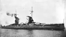 The ship was armed with a main battery of ten 30.5 cm SK L/50 guns in five twin turrets.[1][lower-alpha 3] She disposed with the inefficient hexagonal turret arrangement of previous German battleships; instead, three of the five turrets were mounted on the centerline, with two of them arranged in a superfiring pair aft. The other two turrets were placed en echelon amidships, such that both could fire on the broadside.[3] The ship was also armed with a secondary battery of fourteen 15 cm (5.9 in) SK L/45 guns in casemates amidships. For close-range defense against torpedo boats, she carried eight 8.8 cm (3.5 in) SK L/45 guns in casemates. The ship was also armed with four 8.8 cm L/45 anti-aircraft guns. Her armament was rounded out by five 50 cm (19.7 in) torpedo tubes, all mounted in the ship's hull; one was in the bow, and the other four were on the broadside.[1]