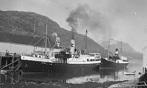 After surviving the German invasion on 9 April and the 62-day-long Norwegian Campaign that followed it, Barøy was set to assist in the transportation of released German prisoners of war from the Norwegian prisoner of war camp on the island of Skorpa in Kvænangen, Troms. Barøy carried out the mission together with Finnmark Fylkesrederi's steamer Tanahorn, the latter carrying some 200 Germans to Tromsø and Barøy taking the remaining 260 to the same port city.[6] Barøy continued serving in Nordnorge's place during the German occupation of Norway,[3] Nordnorge having been sunk by Royal Navy warships during the Norwegian Campaign after she had been pressed into service as a covert troopship by the invading German forces.[7] Barøy was considered too small a vessel for the longer distances, such as the Hurtigruten route between Bergen and Narvik, and her prolonged service on the route was an emergency measure.[3]