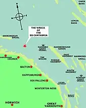 Cantabria's wreck is off the coast of Norfolk, 12 miles ENE[2] of Cromer.[3] She was shelled by the Spanish Nationalist auxiliary cruiser Nadir.
