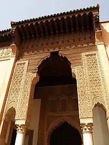 The southernmost chamber was intended to be a small mosque or prayer room, which is why it features a mihrab on its south/southeast wall. In Islamic architecture the mihrab is a niche or alcove symbolizing the qibla (the direction of prayer). The mihrab here resembles that of the Ben Youssef Madrasa (also Saadian in origin): a horseshoe arch surrounded by elaborate stucco decoration and hiding a small muqarnas cupola inside. The decoration of the lower parts of the mihrab, however, appears to have been left unfinished: the outlines of a pattern have been traced but they have not been filled-in and carved.[4][7] This is believed to be due to Ahmad al-Mansur dying before the decoration was completely finished and his successors lacking the will or the resources to finish it.[7] A total of 8 engaged columns, made out of veined marble, are arranged around the base of the mihrab.[4] The rest of the chamber is a large rectangular space marked by four columns supporting arches. The columns and the arches split the upper space of the chamber into 9 rectangular areas, with each division having its own wooden ceiling with star patterns.[4] The ceiling in front of the mihrab, however, is different and instead features a large pyramid-shaped vault of intricate muqarnas (similar in style to the ceiling of the Chamber of Lalla Mas'uda). Since the vault has a square outline, it transitions into the rectangular space with two more sloped surfaces of muqarnas on either side.[4]