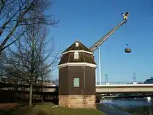 From the first century AD to the fifth century,[10] there was the Gallo-Roman settlement called vicus Saravus west of Saarbrücken's Halberg hill,[11] on the roads from Metz to Worms and from Trier to Strasbourg.[8] Since the first or second century AD,[8] a wooden bridge, later upgraded to stone,[7] connected vicus Saravus with the south-western bank of the Saar, today's St Arnual, where at least one Roman villa was located.[12] In the third century AD, a Mithras shrine was built in a cave in Halberg hill, on the eastern bank of the Saar river, next to today's old "Osthafen" harbor,[13] and a small Roman camp was constructed at the foot of Halberg hill[11] next to the river.[10]