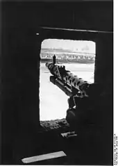 On the ground, Saarbrücken was defended by the 347th Infantry Division commanded by Wolf-Günther Trierenberg in 1945.[20] The US 70th Infantry Division was tasked with punching through the Siegfried Line and taking Saarbrücken. As the fortifications were unusually strong, it first had to take the Siegfried Line fortifications on the French heights near Spicheren overlooking Saarbrücken. This Spichern-Stellung had been constructed in 1940 after the French had fallen back on the Maginot Line during the Phoney War. The 276th Infantry Regiment attacked Forbach on 19 February 1945, and a fierce battle ensued, halting the American advance at the rail-road tracks cutting through Forbach on 22 February 1945.[21] The 274th and 275th Infantry Regiments took Spicheren on 20 February 1945.[21] When the 274th Infantry Regiment captured the Spicheren Heights[21] on 23 February 1945, after a heavy battle on the previous day, the Germans counter-attacked for days, but by 27 February 1945, the heights were fully under American control.[22] A renewed attack on 3 March 1945, allowed units of the 70th Infantry Division to enter Stiring-Wendel and the remainder of Forbach. By 5 March 1945, all of Forbach and major parts of Stiring-Wendel had been taken. However, fighting for Stiring-Wendel, especially for the Simon mine, continued for days.[21] After the German defenders of Stiring-Wendel fell back to Saarbrücken on 12 and 13 March 1945,[23] the 70th Infantry Division still faced a strong segment of the Siegfried Line, which had been reinforced[24] around Saarbrücken as late as 1940. After having the German troops south of the Saar fall back across the Saar at night, the German defenders of Saarbrücken retreated early on 20 March 1945. The 70th Infantry Division flanked Saarbrücken by crossing the Saar north-west of Saarbrücken. The 274th Infantry Regiment entered Saarbrücken on 20 March 1945, fully occupying it the following day, thus ending the war for Saarbrücken.[23]