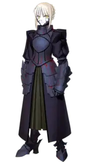 In Heaven's Feel route of Fate/stay night, Saber is consumed by the Holy Grail during a battle with True Assassin and becomes a stronger, corrupted version of her former self, known as Saber Alter, and a Servant under Sakura Matou, the heroine of this route.[19] While Shirou is on his way to seek an alliance with Ilya and Berserker, Saber appears in her Alter form and defeats Berserker, making herself known to Shirou while nearly killing her former allies. Shirou returns to Illya's home and defeats Berserker, who is now working for Sakura. Saber approaches the weakened Shirou but refuses to kill him since she feels honored by his recent fight.[19] In the Normal End and True End, Sakura orders Saber to kill Shirou and the servant Rider. However, the duo manages to overpower Saber, with Shirou killing his former comrade.[20]