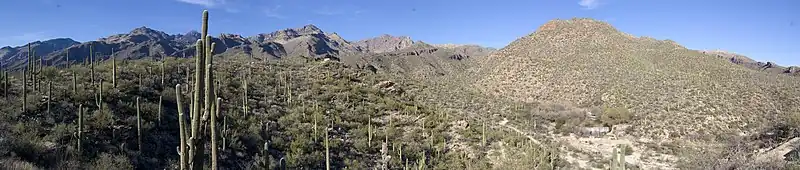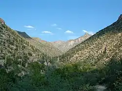 Sabino Canyon is a significant canyon located in the Santa Catalina Mountains[1] and the Coronado National Forest north of Tucson, Arizona, United States. Sabino Canyon is a popular recreation area for residents and visitors of Southern Arizona, providing a place to walk, hike or ride. Minutes away from the desert are large waterfalls along Sabino Creek with minor bridges constructed over them. Wildlife in the canyon includes a range of animals. Some of which are deer, javelina, skunks, tortoises, rattlesnakes and mountain lions.[2] Like most places in Arizona, there are also owls, and scorpion which are very common in Tucson hiking trails.