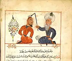 In these treatments, Şerafeddin Sabuncuoğlu used his own observations from experimenting with animals to develop new treatments.[4] Successful treatments were then transcribed to surgical procedures in humans. Şerafeddin Sabuncuoğlu would only transcribe and illustrate the treatments after he completed the treatments himself.[4] He would even test therapeutic treatments on himself before applying them on patients.[10] Şerafeddin Sabuncuoğlu was also aware of sepsis. In order to prevent the spread of a pathogen, he would wear a surgical attire that involved wine and olive oil as antiseptics.[4] In one such treatment, Şerafeddin Sabuncuoğlu discussed a breast cancer treatment in which the suggested treatment was to surgically remove the small cancers in their early stage.[9] This treatment ensures that the tumor does not spread or grow to the rest of the body, which is common practice for treating cancer today. Many of these treatments in Cerrahiyyet’u¨l Haniye have illustrations accompanied next to them, which ensure that the intended audience are able to follow the treatment correctly. Every illustration contains a distinct physician and patient along with the tools used in the treatment.