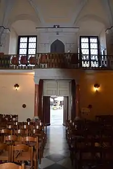 The choir, which you can reach through a small staircase set into the wall, has got a harmonium and is embellished by a wooden parapet. In 1954 under the choir, in order to increase the Church's luminosity, they placed a new wooden inner door with large glasses in four parts, that is formed by two sides small doors and two central ones, with the sign of a cross in the middle (inscribed in the middle of a circle) and made by Vito Fulco. On this occasion they also restored the choir, letting it lean on cement columns with a marble base. During these works they have also changed the first electric installation (dating back to 1912) and placed two small holy water stoups, made in red marble. Outside one of the two windows of the choir there are two bells.