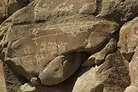 The upper portion of the rock consist of inscriptions which are carved in Sogdian, Kharosthi, Brahmi, Sarada and Proto Sarada languages. The names of the Emperors of the Kushan Empire Kanishka and Huvishka appear in these inscriptions. The name of the Trukha King Ramadusa is also mentioned in inscriptions which are carved in the Brahmi script.[3]