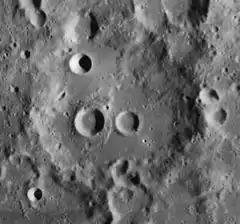 Sacrobosco is an irregular lunar impact crater that is located in the rugged southern highlands to the west of the Rupes Altai escarpment. It is a readily identified feature due to the three circular craters that lie on its floor. The rim of Sacrobosco is heavily worn and eroded, especially in the northeast. The floor is relatively flat in the south, except where overlain by Sacrobosco A and B, but is somewhat irregular in the northeast.