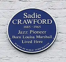 On 16 June 2018, 53 years after her death, a blue plaque was erected on the house in which she was born and lived as a child in Tooting, London, the third in that area of the city. On that occasion it was announced that the nearby Streatham & Clapham High School was introducing an annual scholarship award, the Sadie Crawford Music Scholarship, in memory of her pioneering musical activity.
