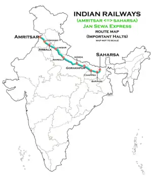 The 14617 / 18 Banmankhi Junction–Amritsar Junction Jan Sewa Express runs from Banmankhi Junction via Saharsa Junction, Barauni Junction, Hajipur Junction, Chhapra Junction, Gorakhpur Junction, Gonda Junction, Moradabad Junction, Laksar Junction, Saharanpur Junction, Ambala Cantonment Junction, Sirhind, Ludhiana Junction, Jalandhar City Junction to Amritsar Junction.