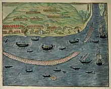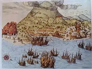 The Spanish governor in the Philippines, Santiago de Vera, tried to strengthen the Iberian positions in Maluku after Babullah's demise. A small fleet of four frigates under Pedro Sarmiento was dispatched from Manila in 1584 and forced the Ternatan dependency Moti Island to submit temporarily with the help of the Tidorese allies. Three frigates were then dispatched to the Bacan Islands to take in foodstuff. However, Kaicili Tolu met them in a sea battle where one frigate exploded as a vat of gunpowder was lit, and the others withdrew to Tidore. In the next year 1585 a larger Spanish fleet appeared in Maluku, driven by fear that the English might try to establish a post in the Spice islands. Saidi was requested to give up the formerly Portuguese fort on Ternate, but gave a vague answer. Supported by the rulers of Tidore, Bacan and northern Sulawesi, the Iberian forces invaded Ternate. The defenders, reinforced by the crews of 30 Javanese merchant vessels, successfully defeated an attempt to storm the fortress. The Spanish commander Juan de Morones was forced to give up the enterprise and shortly returned to Manila.[9] A new expedition with 2,000 Spanish and Filipino soldiers was dispatched in 1593 but faltered due to a mutiny among the Chinese rowers. A few years later Saidi went on the offensive, sending a strong fleet of korakoras (large outriggers) to Mindanao which was loosely claimed by Ternate. They joined local rebels and Malay raiders to fight the Spaniards, but were eventually expelled in 1596.[10]