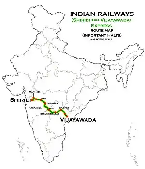 The 17207 / 08 Sainagar Shirdi Vijayawada Express runs from Sainagar Shirdi via Manmad Junction, Aurangabad, Parbhani Junction, Parli Vaijnath ,Latur Road junction, Vikarabad Junction, Secunderabad Junction, Kazipet Junction to Vijayawada Junction.