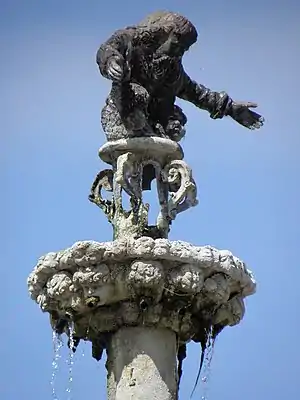 Outside the church is a fine fountain carved from Kersanton stone and dating to 1691. The fountain was the work of the Morlaix mason Jacques Lespaignol and the architect Yves Lageat. A central pillar supports three tiers of circular basins which reduce in size as they reach the fountain's summit and from these basins water flows from the mouths of the heads of small angels arranged around the basin's rims. At the top the Holy Father blesses his son whom John the Baptist is baptizing. These statues are made from lead.[5]