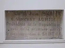Saint-Lô received the Legion of Honour and the Croix de Guerre 1939–1945 on 2 June 1948 with a citation for "capital of the Manche Department which has retained full confidence in the destiny of the country. Suffered on the night of 6–7 June, with a heroic calm, an air bombardment to such a point that its inhabitants could consider themselves as citizens of the capital of the ruins". These awards would be given on 6 June by President Vincent Auriol. The two communes, now absorbed from Sainte-Croix-de-Saint-Lô and Saint-Thomas-de-Saint-Lô, were also decorated with the Croix de Guerre 1939–1945 on 11 November 1948.[28]