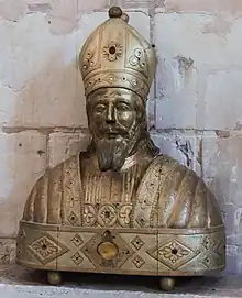 A reliquary-bust of Saint Martin stands on a secondary altar in the south arm of the transept. Made of gilded wood and adorned with artificial stones, it consists of three assembled parts and probably dates from the late 19th century. It depicts Saint Martin wearing a coif and miter.[41]