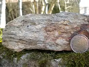 On its western side the upwarp is traversed by a North-South-striking fault zone, which separates the Piégut-Pluviers granodiorite from the paragneisses. This fault zone starts at Lacrète (commune of Étouars) in the South and terminates just south of Massignac in the North.