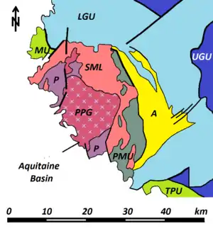 - Parautochthonous Micaschist Unit (PMU), bounded to the West by the intrusive Saint-Mathieu Leucogranite (SML) and to the North by the Chéronnac Leucogranite.
