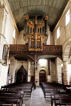 On 8 June 1998, a fire destroyed a part of the north aisle and an extensive programme of restoration was finished in 2005.[3] The Gothic bell-tower and Renaissance tower dates from 1563 and was finished in 1626.[4] The porch has a sculpture depicting Saint Thégonnec in the attire of a bishop and inside the porch, statues of some of the apostles lead towards the door into the church. The church has a rood screen and in the choir area the stained glass is by Jean-Louis Nicolas and dates to 1862-1863.