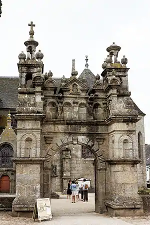 Made from granite quarried from Plounéour-Ménez, this elaborate Renaissance style entrance to the enclos paroissial is attributed to the masons of the nearby Château de Kerjean's workshop. Four massive pillars, topped with cubic lanterons, form three entrances, with the central section forming an arch. Statues of the Archangel Gabriel and the Virgin Mary seated at a prie-dieu, depict the Annunciation and decorate the structure which has four niches decorated with carvings of shells these separated by pilasters and dominated by two canons. There is also a sculpture depicting Saint Thégonnec riding an ass. A sculpture depicting the Holy Father is contained in a triangular topped niche at the top of the central arch. The two side entrances have stiles to stop animals accessing the enclos and the central arch has iron gates.[4][6][7]