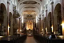 The church suffered from fires on several occasions, the most devastating of which took place on May 21, 1917.[2] The town, not having a pipe system, had been on flames for more than two days by the time water could be transported from the nearby village of Vámosgyörk.[2] By that time the town and also the church had been severely damaged. Nearly 600 houses were burnt down, but only 11 people died.[2] Even the soldiers were allowed from the frontlines of World War I to go home to help rebuild the town.[2] The reconstruction of the church could start in 1920 and ended in 1922. The architects were Nagy Virgil and Wälder Gyula.[3] The inner decoration and the fresques were made by the best of the age, such as Tardos Krenner Viktor and Dudits Andor, whose paintings can also be found in the building of the Parliament.[3] The church was last renovated in 1992 when the walls were entirely repainted.