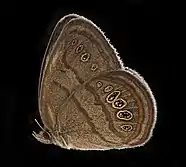 The Saint Francis's satyr (Neonympha mitchellii francisci) is an endangered butterfly subspecies found only in the US state of North Carolina. First discovered in 1983, it was first described by David K. Parshall and Thomas W. Kral in 1989 and listed as federally endangered by the US Fish and Wildlife Service in 1994. It is a subspecies of N. mitchellii and is restricted to a single metapopulation on Fort Liberty military base in Hoke and Cumberland counties.[7] The other subspecies, Mitchell's satyr (Neonympha mitchellii mitchellii), is also federally endangered.[8]