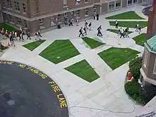 In 1999, a 16.5-acre (0.067 km2) parcel of land behind the school's football field on Big Tree Road was acquired. Practice fields and additional playing fields were constructed in that space.[2] The science labs in Friar's Hall were overhauled and modernized in 2003. In November 2004 an expansion of Justin Hall and the gymnasium began. In late 2005 construction was completed and the new facility included additional classrooms; separate locker-rooms for gym classes, home teams, opposing teams, and referees; an additional gym floor, and an athletic trainer's room. At the time of construction the campus traffic pattern was also changed. Previously traffic blowed between the two major complexes on campus, essentially forming a sea of parking and traffic. The update saw the addition of a 52-space parking lot on the Lake Erie side of Friar's Hall and the creation of a traditional grass quadrangle with walkways between Friar's and Justin Halls. In 2007, construction began on the new Mary Schneider Visual Arts Center located in the lower floor of Friar's Hall. It features 4,695 sq ft (436.2 m2) of floor space and includes space for art classes and storage. Also included are a new classroom and a teachers' dining room.[2]