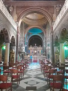 The church is a long three-aisled basilica with a dome and two bell towers of the neoclassical style, an original composition that combines Western Renaissance and Byzantine influences. A prominent feature are its two side double naves before the gated altar.[1][5] On the left nave there is a mural depicting the teaching of the Apostle Paul on the Areopagus, an important work by Spyridon Hatzigiannopoulos, while the mural on the right nave of the transversal aisle, depicts the teachings of Jesus in Jerusalem by Ath. G. Vassiliou.[3] The basilica has a wooden roof, a columned narthex and a dome modeled after the monasteries of Mount Athos.[6] Even though it was not considered grand enough to be the cathedral of Athens, it remains an important work of Byzantine-influenced architecture.[5]