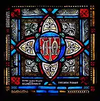 The present church building, built in 1872, was an American adaptation of the Oxford Movement in sanctuary design. Other features included coursed rows of rough-hewn blue limestone with stringcourses, sills and lintels of brownstone, stained-glass Gothic windows; and a bell tower with a stone steeple. Two heavy oak doors, painted red, are covered with elaborate scrolled pattern in bronze reminiscent of the Lichfield Cathedral in England. The foyer at the tower's base is decorated in the Arts & Crafts style, the ceiling have sixty small six-point stars cut into the ceiling and illuminated from above.[6] In December 1871, a fire in the town's business district destroyed the Federalist style sanctuary built in 1832 at the corner of Jonathan and Antietam Streets. The initial sanctuary space was sparsely, but tastefully, accommodated.