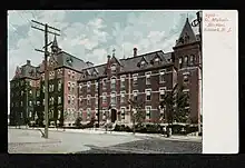 The original building was a converted residence containing 13 beds. By July 1869, 10 sisters were looking after 34 inpatient beds, with demand for more.[2] In 1869, the cornerstone was laid for a new building, designed by Jeremiah O'Rourke. The 3-story, 150 bed, red brick hospital, located on the corner of Central Ave. and Dr. Martin Luther King Jr. Blvd., was opened in 1871.[3][7] It was described in 1873 as "a bijou of a hospital, perfect in all its accommodations from cellar to attic, and it would be difficult to overpraise its administration and equipment."[2][8]