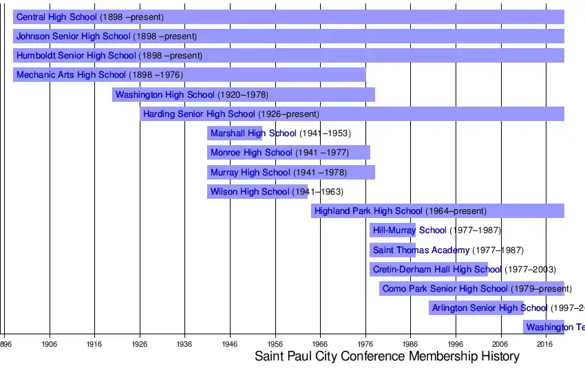 The Saint Paul City Conference is the athletic conference for seven high schools in the city of Saint Paul, Minnesota, United States. Much like the divisions in professional sports, the Saint Paul City Conference is one of many in the state that divides schools in close proximity into different conferences.[1] It is the second oldest conference in the state behind the Minneapolis City Conference. The conference officially began on Friday, October 28, 1898 when Central High School and Mechanic Arts High School played the first football game between the schools.[2]