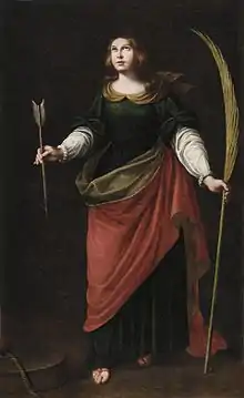 Attributeswith Saint Acisclus, her brother,[1] crowned with roses, arrow and palm branch