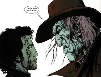 The Saint of Killers first appeared as a heartless murderer, who is transformed into the Angel of Death under the condition that he takes up the role of collecting the souls of those who die by violence. Following his reanimation, Heaven arranged for him to be put into a deep slumber, until he was needed to kill people. The Saint was a primary antagonist in the Preacher series, who is tasked by Heaven to kill protagonist Jesse Custer due to his possession by the entity Genesis.[9] Aside from Ennis and Dillon's Preacher, the Saint was featured in his own four-issue limited series, Preacher: Saint of Killers, which expanded on the Saint's background and motivation,[10] and has appeared briefly in the DC Comics series Hitman, cantered on a "wise-cracking assassin plying his trade in Gotham City",[7] and was portrayed by Graham McTavish in the television series adaptation of Preacher; simply referred to as The Cowboy in the first season, the character's real name is revealed to be William Munny in the series' second season, after Clint Eastwood's character from Unforgiven,[11] who was initially cited by Ennis (along with fellow actor Lee Marvin) as his principal inspiration for the Saint's design in the original comic series, with artists Dillon and Glenn Fabry making him look far more physically imposing. The Saint's character and the nature of his evil have been the subject of considerable critical attention.[12]