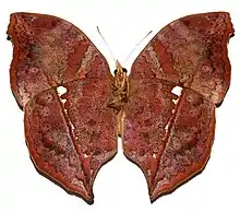 It is a butterfly with a black body covered with orange-brown hair; claviform antennae; above the orange-colored, anterior wings edged with black integrating a bluish-whitish spot; posterior also orange and margins along the veins of the wing brown - black. The underside is gray - black and reminds of a dead leaf, which serves as camouflage; a whitish line runs through the wings of the posterior edge of the hindwing of the anterior edge of the forewing: between this "line" and the body, the wings are darker than between the "line" and the edges of the wings. Its wings are bent.