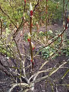 Growing to 3 m (9.8 ft) in height, it is a spreading deciduous shrub with prominent new green growth which turns a shiny brown in its second season. Bright red buds appear in winter, followed by erect catkins. The leaves are glossy green on the upper (abaxial) surface, and dull grey on the lower (adaxial) surface. It has gained the Royal Horticultural Society’s Award of Garden Merit.[2][3]