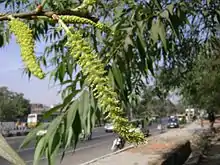 Salix tetrasperma, commonly called Indian willow, is a medium-sized tree of wet and swampy places, shedding its leaves at the end of monsoon season. It flowers after leafing. The bark is rough, with deep, vertical fissures and the young shoots leaves are silky. The leaves are lance-like, or ovate-lancelike, 8–15 cm long, with minutely and regularly toothed margins. The male sweet scented catkins are 5–10 cm long, and are borne on leafy branchlets. The female catkins are 8–12 cm long. The capsules are long, stipulate, in groups of 3 to 4.