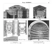 The new theatre on the rue Feydeau was built in just over six months in a neoclassical style to the designs by the architects Jacques Legrand and Jacques Molinos and had a capacity of 1700–1900.[2] These designers were not too concerned with the practicality of the theatre space, but more with the splendor of the theatre. It was a rectangular building that was curved on the side of the lobby at the front. On the curved front were seven massive windows that let natural light into the lobby. In between these windows were statues that were the same height as the windows. The architects also included "carriage entrances at ground level that allowed theatre goers to disembark inside a protected vestibule" or entrance hall between an outer door and the main part of the building. These features, along with the statues on the outside of the lobby, were novel and attracted a lot of attention.[10][11]